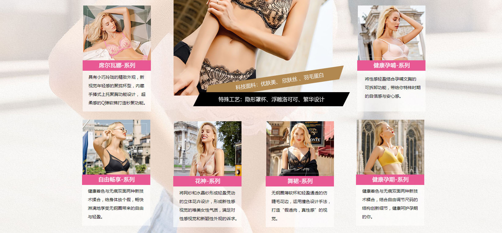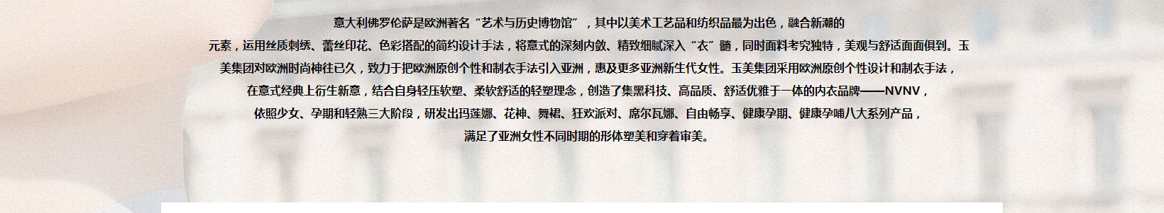 源自意大利的未來(lái)的潮流設計師品牌NVNV是浙江恩薇健康科技有限公司(意大利公司名Olivo Srls)旗下的舒適高級內衣品牌, 結合中國女性不同時(shí)期的形體特征和審美訴求,邀請設計專(zhuān)家于意大利當地深入探究多年,采用歐洲原創(chuàng )個(gè)性設計和制衣手法, 在意式經(jīng)典基礎上衍生新意,最終打造出屬于中國女性的潮流設計師內衣品牌NVNV。NVNV品牌致力于打造集高品質(zhì)、黑科技、舒適、高貴優(yōu)雅、舒適自由于一體的內衣,專(zhuān)注于淋漓展現女性理想胸型、自然曲線(xiàn),滿(mǎn)足亞洲女性不同時(shí)期的身材要求,因而產(chǎn)品依據少女(青春)、孕期(孕中和產(chǎn)后修復及哺乳期)、成熟女性(孕后)等三大階段,研發(fā)出瑪蓮娜、花神、舞裙、狂歡派對、席爾瓦娜、自由暢享、健康孕期、健康孕哺等八大系列產(chǎn)品,使亞洲新生代女性在每個(gè)人生階段都能展示理想身型,成為身材美學(xué)家,并為其帶來(lái)源自意大利的未來(lái)時(shí)尚生活。